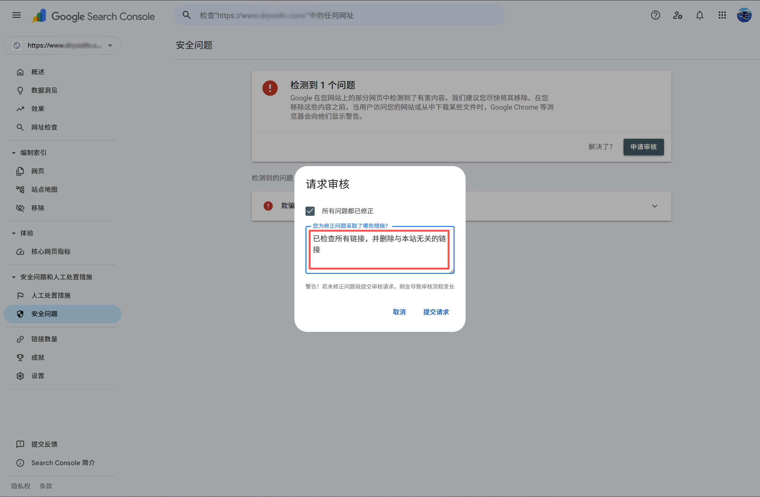4、最后在确认网站已彻底清理并修复后,请回到 Google Search Console 的“安全问题”页面,点击“申请审核” (Request a review),并简要说明我们已经采取了哪些清理措施。Google 审核通过后,红色的警告页面就会被解除。可以填写“已检查所有链接,并删除与本站无关的链接”,如图: